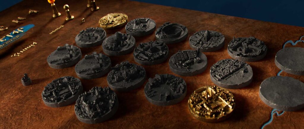 The map appears handcrafted, featuring modelled sculpture-like miniatures made from wood or metal for specific locations or recognisable points. Additionally, rivers, lakes, and similar features were hand-painted to enhance the handmade effect. The base map is quite large (84,000 px) and is based on real geographical data. After gathering all the data, we applied hand-painted treatment throughout the map to soften its technical appearance and achieve a more artisanal feel.