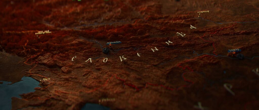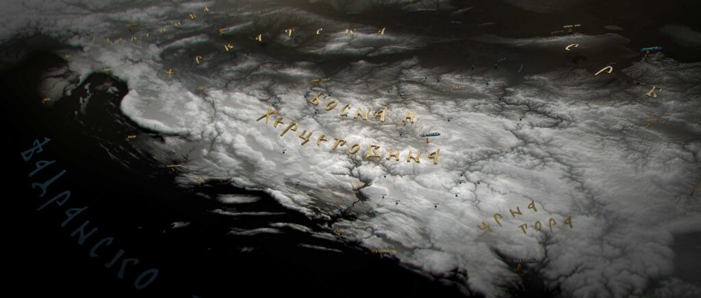 For typography, we chose a medieval, authentic variant of the Cyrillic alphabet known as Bosancica. Although some of the letters do not exist in the modern alphabet, it remains readable. For names that are difficult to read, we replaced the first few letters with recognisable ones to enhance visual readability. Additionally, we incorporated archaic or period-specific names for certain locations.
